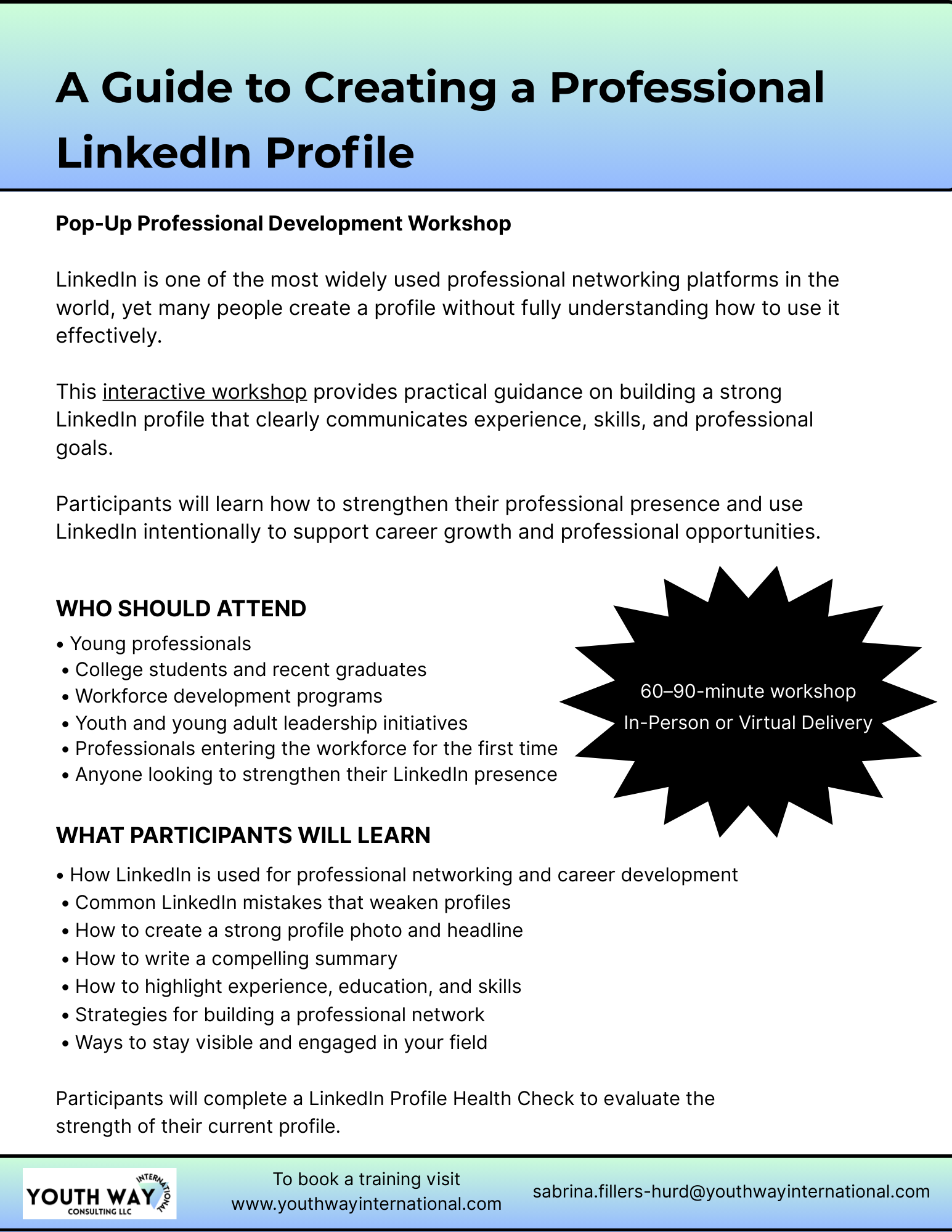 This workshop helps participants understand how to create a LinkedIn presence that reflects their skills, experiences, and professional potential.